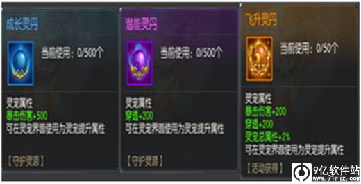 可使用成长灵丹、潜能灵丹和飞升灵丹给灵宠提升属性,三者的使用上限分别为500、500和50