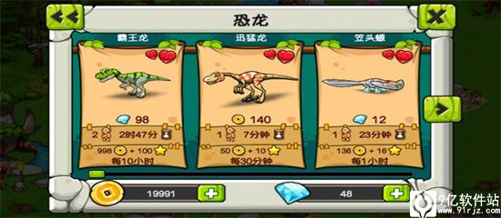 3、招聘到饲养员之后,下一步就是领养恐龙宝宝!点击主屏右下角恐龙标识按钮,选择想要领养的恐龙并为它建造巢穴,一个基础恐龙就领养成功啦。