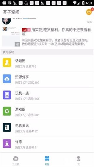 2.来到社区页面,这里可以分享话题,查看话题圈;也能进入资源分享下载资源