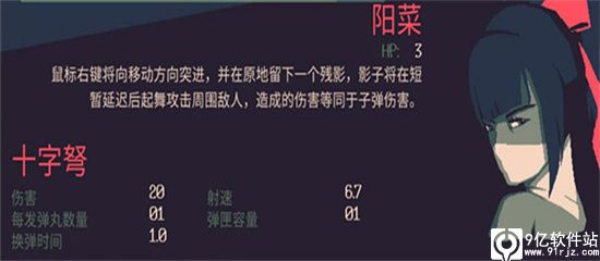 HP:3鼠标右键将向移动方向突进,并在原地留下一个残影,影子将在短暂延迟后起舞攻击周围敌人,造成的伤害等同于子弹伤害。