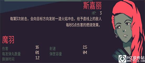 HP:3每第3次射击,会向目标方向发射一道火焰冲击,给予直线上的敌人每秒3点伤害的燃烧效果。