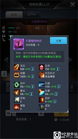特种兵特点:增加对坦克伤害25%,自带闪避。