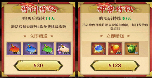 按按需购买的特权,特训特权能加快特训材料获取速度,柱子的养成进度会有较快的提升等于每天1块可以多挑战4次,比较划算的特权;神兽特权想当于一个大月卡的功能,开启神兽后能每天领材料,许愿也有折扣,需要冲神兽的时候必买一个