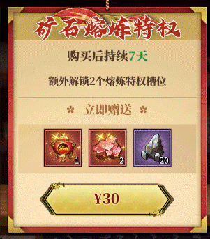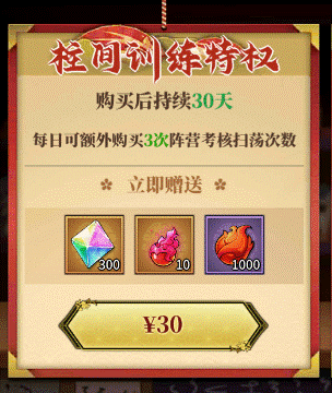 30天的额外考核扫荡次数,角色养成的峰值期建议购买,一天投入1块钱,比较划算的常驻特权