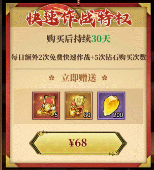 前期必买特权,游戏前期重要程度高于所有特权内容,增加快速作战次数,增加经验获取,中期如果有追赶需求可以买,后期可以不太需要
