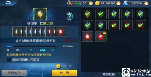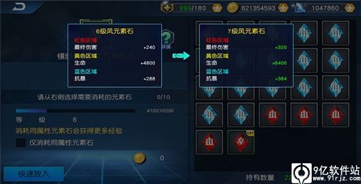 进行元素石升级也可以将我们用不到的低等级元素石利用起来,也避免了我们将低等级元素石放在背包里浪费的尴尬。每次进行元素石的升级时需要放入10个元素石,等级不受限制,当然等级越高的元素石会提供更多的经验,而且消耗同属性元素石也会获得更多的经验。