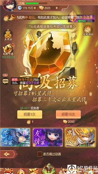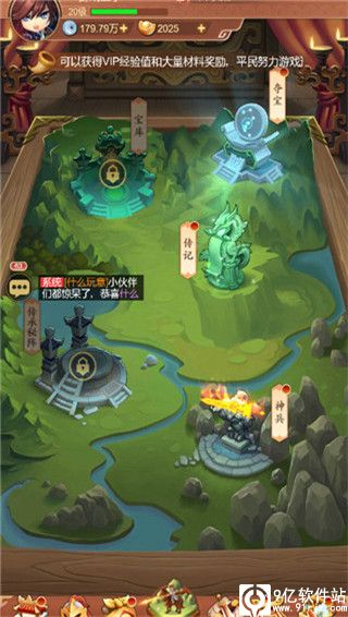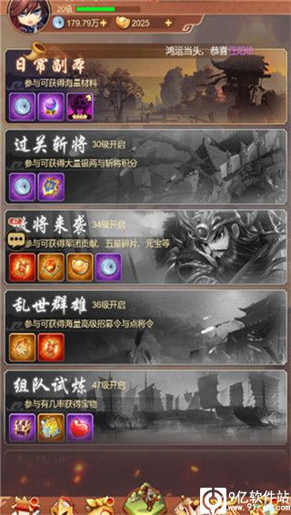 3、游戏还有日常副本、过关斩将、敌将来袭、乱世群雄、组队试炼等玩法,通过这些玩法,可以获得大量升级材料、银两、碎片、元宝、宝物等。