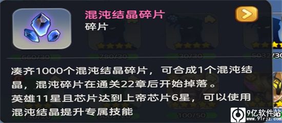 8、混沌结晶:还有英雄碎片,各色禁器碎片,装备掉落这类就不一一解释了。前期英雄可以随便升级,一直到9星都可以花费20砖石回退。