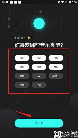 1、下载安装波点音乐app官方版后,首次使用系统会先询问你喜欢的音乐类型。