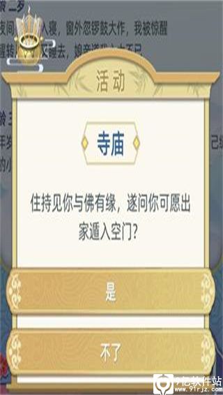 2) 寺庙找住持聊天,有几率让你出家(必须持有至少10两银子才能见到住持,见住持时给的钱越多几率越大,抓周抓到相关物品出家几率增加)