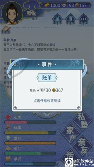 偶然发现一个需要运气的bug:男孩8岁前持有至少10两银子,找住持聊天,给10两以上可触发出家剧情(给的越多,几率越大),选择是,然后还俗,就可以直接开始学艺,可选职业有:木匠、玉匠、铁匠,可能会出现茶师、琴师、弈师、画师,然后8岁时仍可选择读书,前面的职业会保留,如果升到学徒以上等级每年都会有工资,然后要是中举,就可以收两份工钱啦~唯一遗憾的就是前面的那个职业加薪;如果没有中举,选择了别的职业会打破bug,一切按现有的职业来算