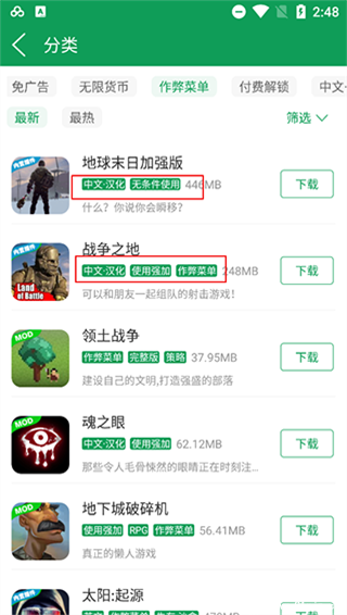 3、小编以作弊菜单类型为例,不同的游戏有着不同的破解内容,软件的名字下方会提示相应的破解内容关键字,非常的简单明了。