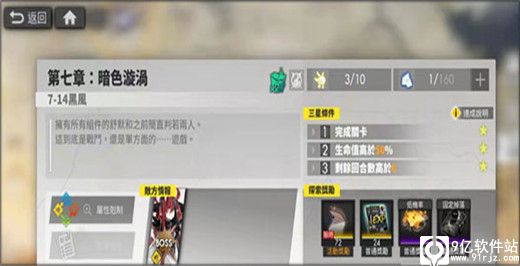 7-14关卡名为暗色旋涡,是主线剧情第七章的最后一关,理所当然,这一关当然是首领战了,敌方的首领名为舒莫,是杀害空裔一族的凶手之一,也是从这一关开始,游戏的剧情高潮就此开始。