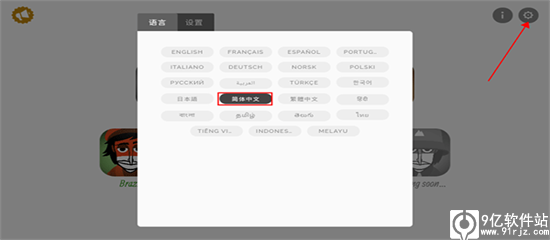 2、点击右上角的齿轮,可以切换语言,把游戏设置成简体中文