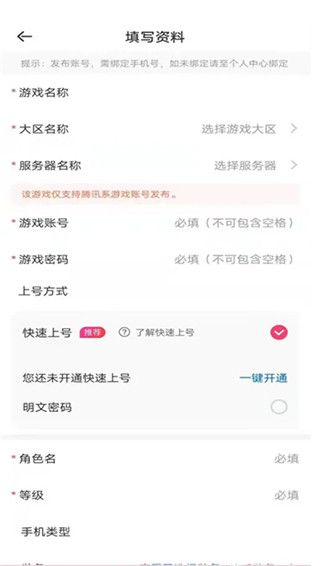 3、点击选择需要发布的游戏名称,输入该游戏大区,角色,等级等游戏信息。