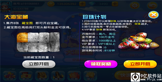 一、入门攻略大宝藏:高级房击杀双头鲸和金龙时有概率获得“藏宝图”,收集齐8张藏宝图后可以进入大海宝藏地图进行挑战。大鱼好打,福利多多!