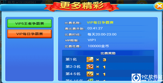 VIP每日争霸赛:每天20:00~23:00可以参与,排名越靠前的玩家奖励越好。