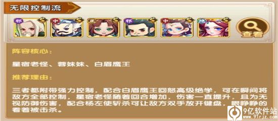 推荐理由:三者都附带强力控制,配合白眉鹰王回怒高级绝学,可在瞬间将敌方全部控制,星宿老怪随着回合增加,伤害一直提升,且为无视防御伤害,配合杨左使斩杀可让敌方双手放开键盘,眼睁睁的看着被击杀。