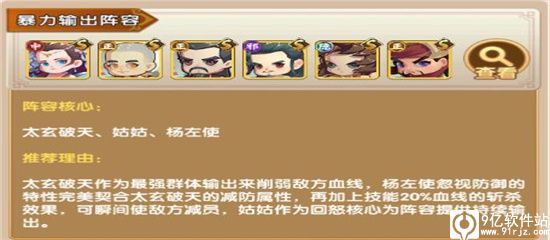 推荐理由:太玄破天作为最强群体输出来削弱敌方血线,杨左使忽视防御的特性完美契合太玄破天的减防属性,再加上技能20%血线的斩杀效果,可瞬间使敌方减员,姑姑作为回怒核心为阵容提供持续输出