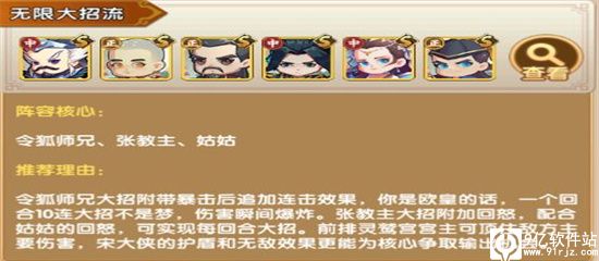推荐理由:令狐师兄大招附带暴击后追加连击效果,你是欧皇的话,一个回合10连大招不是梦,伤害瞬间爆炸。张教主大招附加回怒,配合姑姑的回怒,可实现每回合大招。前排灵鹫宫宫主可项住敌方主要伤害,宋大侠的护盾和无敌效果更能为核心争取输出机会。