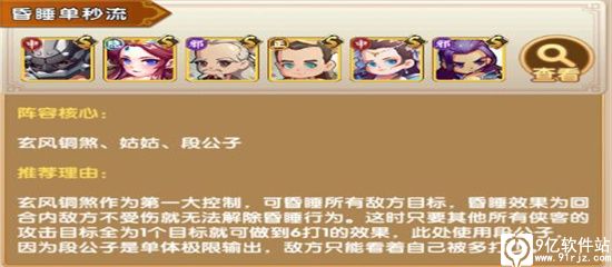 推荐理由:玄风铜煞作为第一大控制,可昏睡所有敌方目标,昏睡效果为回合内敌方不受伤就无法解除昏睡行为。这时只要其他所有侠客的攻击目标全为1个目标就可做到6打1的效果,此处使用段公子,因为段公子是单体极限输出,敌方只能看着自己被多打少。