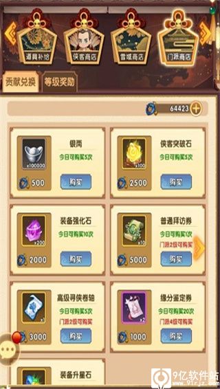2、门派商会:获得的门派贡献可在商会购买珍稀道具 ,门派等级越高,可购买的道具越高级,所以多邀请一些大侠一起开宗立派,扩大势力。