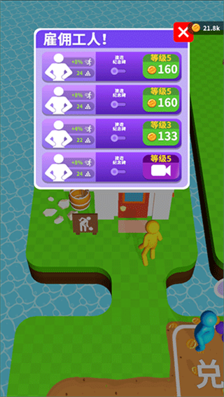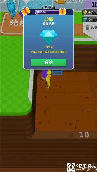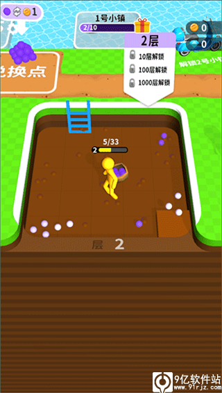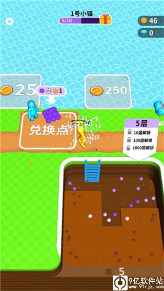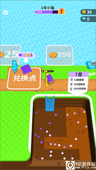 4、背包装满时,我们可以拿到兑换点进行兑换金币,拥有足够多的金币我们就能解锁小镇,雇佣工人帮助我们挖土;