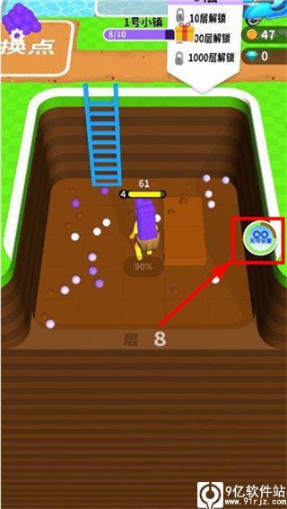 2、从第三层开始,我们就可以挖掘出这些紫色小球,收集这些小球,可以拿去兑换点进行兑换金币;