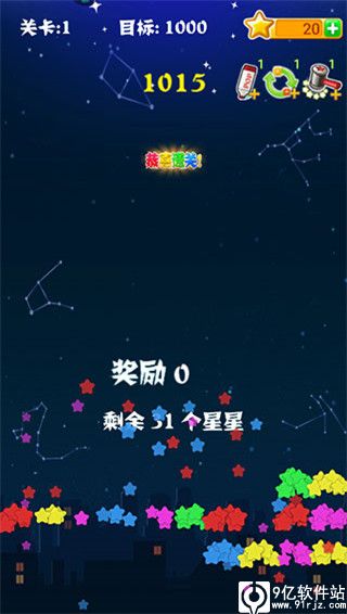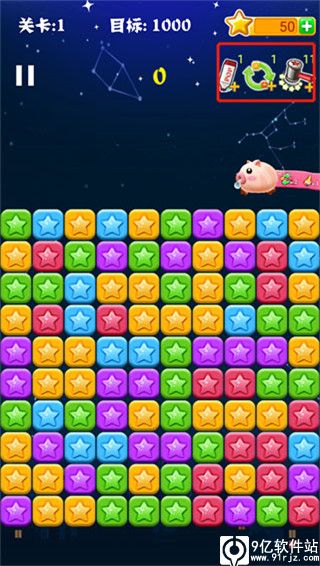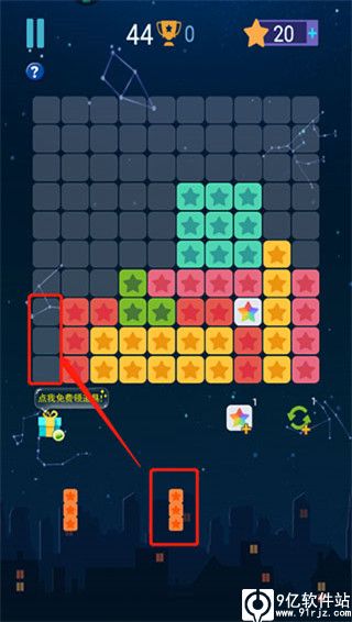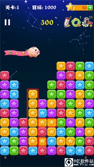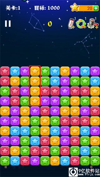 2、消除方法是,点击颜色相同成块的方块或者星星,它就能被消除,同时消除的方块越多分值越高,你也可以尽量让所有的方块被消除,那可是很厉害的。