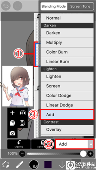 2、点击图层1让添加的图层成为当前图层,然后点“add”打开“混合模式菜单”,选择“添加”