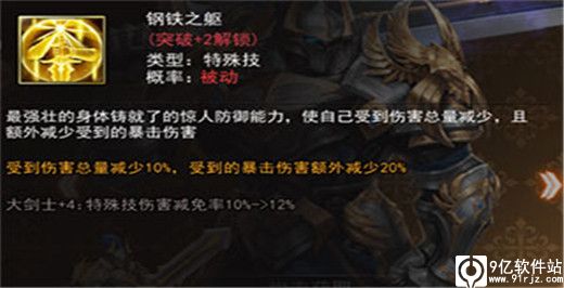 特殊技:最强壮身体铸就了的惊人防御能力,收到的伤害总量减少,收到的暴击伤害额外减少一定数额。
