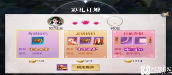 成为仙侣,与异性好友亲密度达到520后,即可进行结婚,完成结婚流程一共有3个步骤。首先,一方要提出彩礼订亲,系统有3个不同档次的彩礼可以选择,赠送彩礼后仙侣双方都可获得奖励。