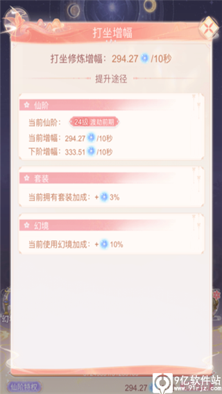 1、【打坐】首先来说说打坐,仙主大人通过在线/离线打坐,均可按照指定的倍率积累修为,值得注意的是,修为的累积上限是168小时,超时将会自动停止累积,仙主大人们切记及时上线领取哦。修为的获取效率主要通过三个途径来增加:仙阶,套装,幻境。当前修为的获取效益可点击【增幅详情】查看。