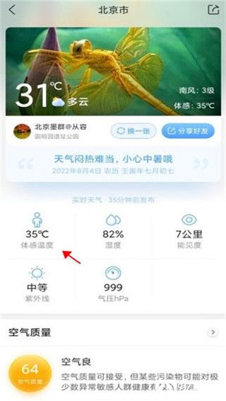 2、就可以进一步看到目前的体感温度,以及湿度、能见度和气压等数据;