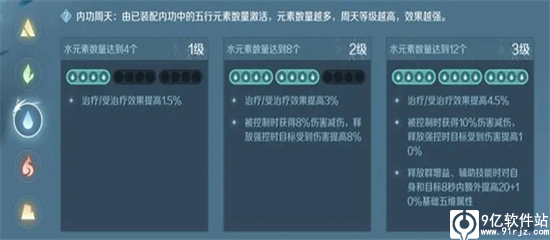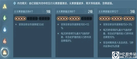 ② 蕴含元素:通过元素数量来获得内功周天效果,元素数量越多,周天效果越好。每个内功的元素是固定的,获取内功后可以看到每个内功之后会生成哪些元素。