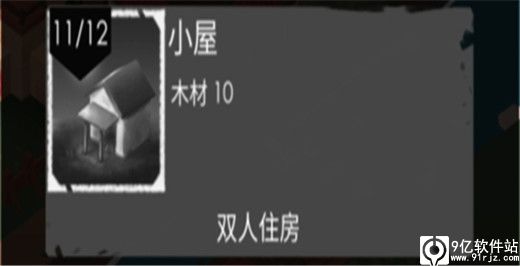 小屋需要使用10木材进行建造。工人可以在小屋中进行休息,恢复精力。没有小屋居住的工人将在篝火旁进行休息,在篝火旁休息的工人精力不会得到恢复,还可能遭受夜晚怪物的袭击,在小屋中休息可以躲避怪物袭击。建造足够的小屋有助于减少工人损失,小屋后续可以升级,一个小屋最多只能居住5人。