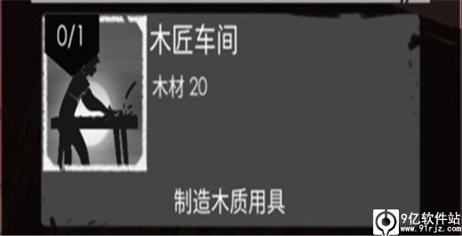 木匠车间需要使用20木材进行建造。玩家可以在木匠车间中设置一位工人成为木匠,在这里建造木质工具。在木匠车间中可以制造锤子、手推车、木矛等工具,可以用来加快工人们的工作速度,也可以用来制作简单的武器。木匠车间的物品都需要使用木材进行制造,后续可以升级,每升级一次就可以制作新物品,最高可升至3级。