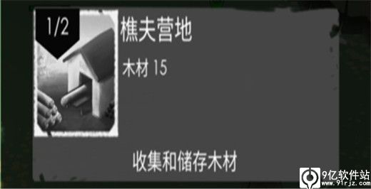 樵夫营地需要使用15木材进行建造。玩家可以在樵夫营地中设置两位工人成为木匠。木匠会砍伐周围树木储存在樵夫营地,木材可用来制造一些木质生活工具还可以用于一些建筑的升级,樵夫营地用于储存木材资源,一旦物品储存满了,玩家可以升级樵夫营地,最高可升至3级。