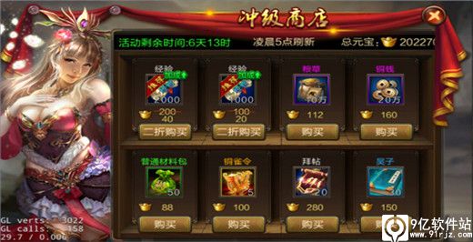 建立角色前7日,每日均会开放一个冲级商店,在商店中除了能买到铜钱粮草等游戏资源外,还可以超低价值购买2份经验值。推荐星数:★★★★