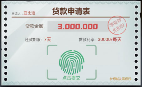 钱是贷了,还不上怎么办呢?相信这也是董事长非常关心的一个问题。其实这完全就不用担心,董事长公司的收入每天都在快速增长,今天贷的款占公司收入的10%,明天可能只占公司收入的1%了,何况梦想城银行给董事长的每笔贷款都设置了7天的还款期限,当到期之后银行也只会在董事长领取店铺收益的时候自动扣除50%的收入作为银行还款,直到还清那笔贷款。
