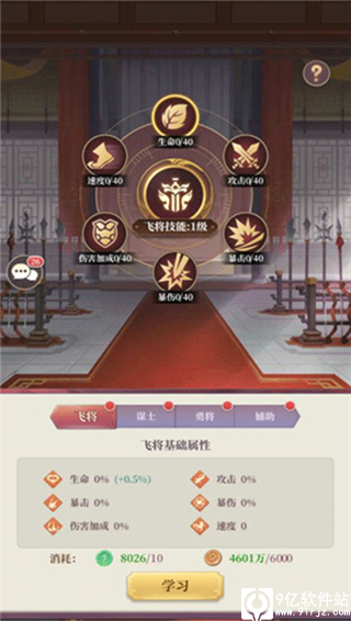 飞将、勇将、谋士、辅助四个职业对应各自的联盟技能,每一类只对相应的职业加成。消耗铜钱和青龙玉可以提高对应职业的基础属性。