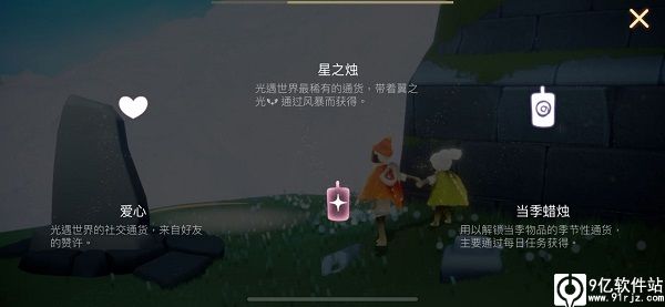 点击游戏界面的左上角可以看到我们拥有的蜡烛数量。从左到右依次是普通蜡烛、季节限定蜡烛、爱心。这3个是游戏中的货币。其他人赠送给自己蜡烛时,我们就可以获得爱心。