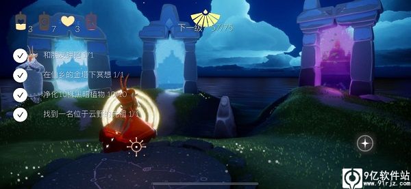 找到黄色人影,与它们互动 收集“光之翼”,我们的 飞行技能就可以得到 升级――斗篷背后 星星的数量就代表我们的飞行级别。