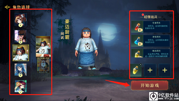 4、再然后就可以进行角色选择了,玩家等级越高解锁的角色就越多,右边还可以添加道具,准备好了就可以点击开始游戏。
