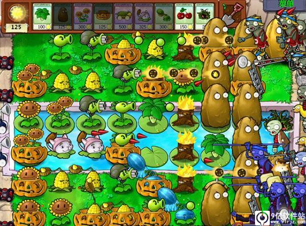 2、其次的是,海豚怪(海豚僵尸)和胖子(红眼僵尸)飞出来的小怪,因为他们一出也是一叠,咬一下就够呛了,因此要注意图中南瓜的完整,注意补完。