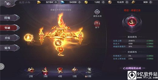 圣物突破需要花费创造晶石、黎明印记、时间沙漏进行突破,并为勇士增加圣痕属性(基础属性、技能特殊效果、高级属性)、圣物聚魂属性、基础属性(附魔+突破),可以在属性总览中查看。