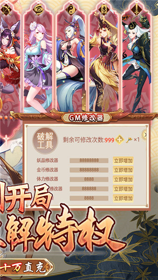 1:白嫖福利GM破解器,每日免费破解海量道具,妖晶、梦魇妖壶拿到手软2:上线输入LB666666就送SP限定逸事札和强力妖灵师。