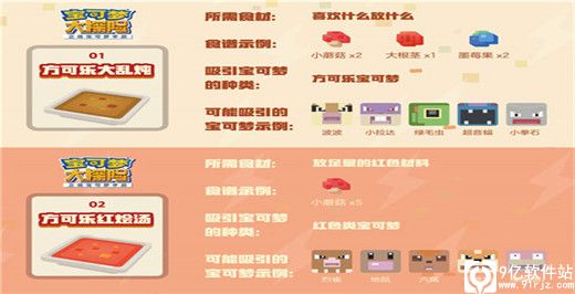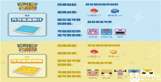 方可乐蓝梦汁需要放入足量的蓝色材料,它会吸引蓝色类宝可梦,可能吸引到尼多朗、玛瑙水母、阿伯蛇、臭泥等宝可梦。方可乐黄焖锅需要放入足量的黄色材料,它将吸引黄色类宝可梦,如独角虫、穿山鼠、波波、可达鸭、小火马等宝可梦有可能被吸引。