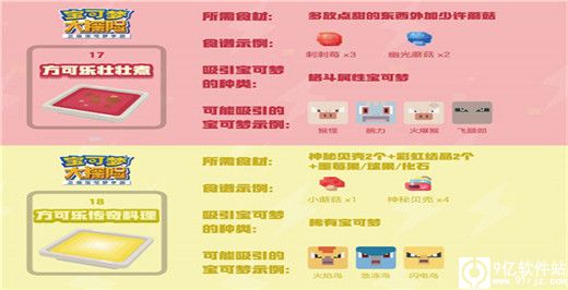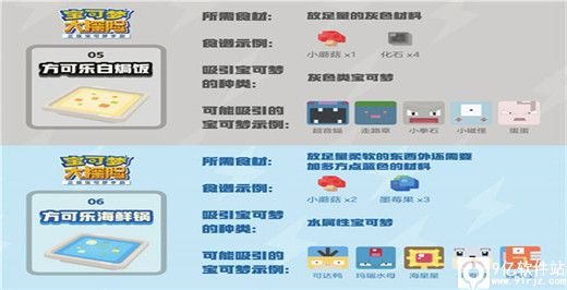 方可乐白焗饭需要放入足量的灰色材料,它将吸引灰色类宝可梦,可能吸引到超音蝠、走路草、小拳石、小磁怪等。从方可乐海鲜锅开始,复合型口味的魅力开始呈现,放入足量柔软的东西和蓝色材料,可以吸引水属性宝可梦,可能吸引到可达鸭、玛瑙水母、海星星、小海狮、鲤鱼王等。