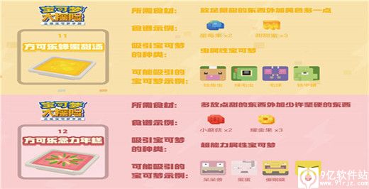 方可乐蜂蜜甜汤需要放入足量甜的东西外加多一点黄色材料,会吸引虫属性宝可梦,可能吸引来独角虫、绿毛虫、毛球、铁甲蛹等。方可乐念力年糕作为固态料理,在大量甜味食材外还要加少许坚硬的东西,它会吸引超能力属性宝可梦,可能吸引来呆呆兽、蛋蛋、催眠貘、凯西等。